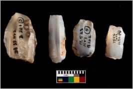 | Description / विवरण | Specimen of a fluted cores with few broad fluted marks indicating the detached blades from it. Some of them are tapering at one end. |