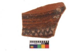 | Description / विवरण | Specimen of potsherd with decorative geometric painting. Type Black on Red Ware . |