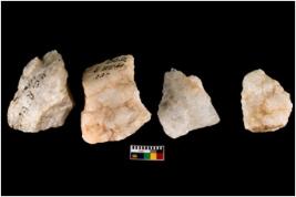 | Description / विवरण | Specimen of cores with weathered cortex and very few fluted marks. Most of them are uneven whereas some are tapering at one end. |