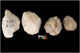 | Description / विवरण | Specimen of cores with weathered cortex and very few fluted marks. Most of them are uneven whereas some are tapering at one end. |