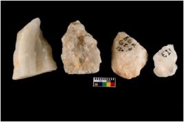 | Description / विवरण | Specimen of cores with weathered cortex and very few fluted marks. Most of them are uneven whereas some are tapering at one end. |