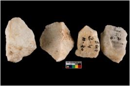 | Description / विवरण | Specimen of cores with weathered cortex and very few fluted marks. Most of them are uneven whereas some are tapering at one end. |