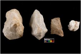 | Description / विवरण | Specimen of cores with weathered cortex and very few fluted marks. Most of them are uneven whereas some are tapering at one end. |
