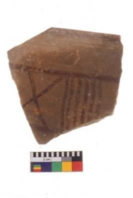 | Description / विवरण | Specimen of potsherd with decorative geometric painting. Type Black on Red Ware . |