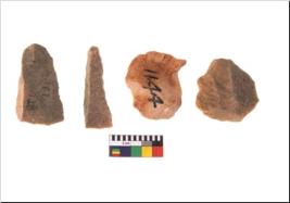| Description / विवरण | Specimen of flake tool with prominent flaking marks. They are made up of a short flakes with sides trimmed. |