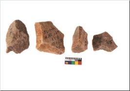 | Description / विवरण | Specimen of flake tool with prominent flaking marks. They are made up of a short flakes with sides trimmed. |