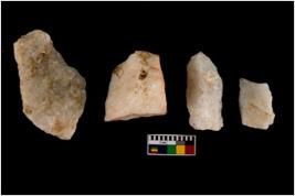 | Description / विवरण | Specimen of cores with weathered cortex and very few fluted marks. Most of them are uneven whereas some are tapering at one end. |