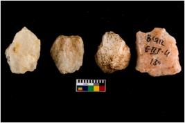 | Description / विवरण | Specimen of cores with weathered cortex and very few fluted marks. Most of them are uneven whereas some are tapering at one end. |