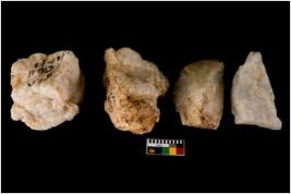 | Description / विवरण | Specimen of cores with weathered cortex and very few fluted marks. Most of them are uneven whereas some are tapering at one end. |