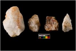 | Description / विवरण | Specimen of cores with weathered cortex and very few fluted marks. Most of them are uneven whereas some are tapering at one end. |