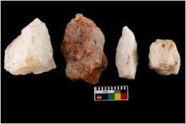 | Description / विवरण | Specimen of cores with weathered cortex and very few fluted marks. Most of them are uneven whereas some are tapering at one end. |
