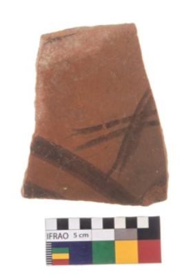 | Description / विवरण | Specimen of Potsherd black on red painted pottery. It is fine fabric in sharp contrast with painted design are executed in black pigment. |