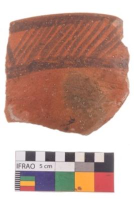 | Description / विवरण | Specimen of potsherd black on red painted pottery. It is fine fabric in sharp contrast with painted design are executed in black pigment. |