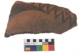 | Description / विवरण | Specimen of potsherd black on red painted pottery. It is fine fabric in sharp contrast with painted design are executed in black pigment. |