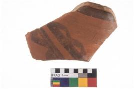 | Description / विवरण | Specimen of potsherd black on red painted pottery. It is fine fabric in sharp contrast with painted design are executed in black pigment. |