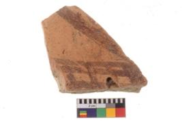 | Description / विवरण | Specimen of potsherd with decorative geometric painting. Type Black on Red Ware . |