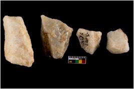 | Description / विवरण | Specimen of cores with weathered cortex and very few fluted marks. Most of them are uneven whereas some are tapering at one end. |