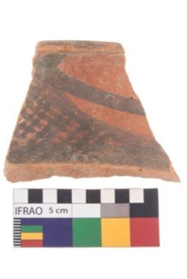 | Description / विवरण | Specimen of potsherd black on red painted pottery. It is fine fabric in sharp contrast with painted design are executed in black pigment. |
