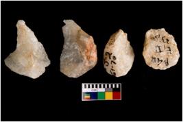 | Description / विवरण | Specimen of cores with weathered cortex and very few fluted marks. Most of them are uneven whereas some are tapering at one end. |