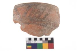 | Description / विवरण | Specimen of potsherd black on red painted pottery. It is fine fabric in sharp contrast with painted design are executed in black pigment. |