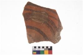 | Description / विवरण | Specimen of potsherd black on red painted pottery. It is fine fabric in sharp contrast with painted design are executed in black pigment. |
