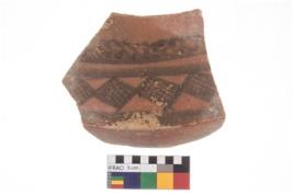 | Description / विवरण | Specimen of potsherd with black decorative geometric diamond set broad horizontal bands painting. |