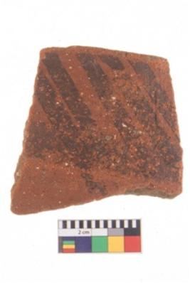 | Description / विवरण | Specimen of potsherd black on red painted pottery. It is fine fabric in sharp contrast with painted design are executed in black pigment. |