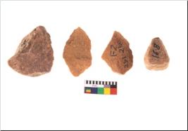 | Description / विवरण | Specimen of flake tool with prominent flaking marks. They are made up of a short flakes with sides trimmed and most of them are rectangular in shape. |