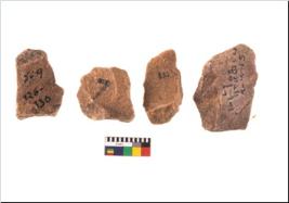 | Description / विवरण | Specimen of flake tool with prominent flaking marks. They are made up of a short flakes with sides trimmed and most of them are rectangular in shape. |