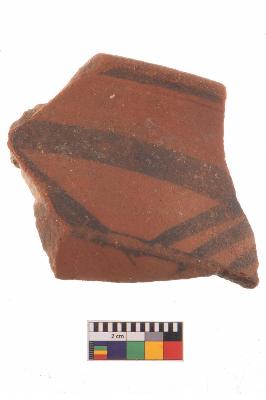 | Description / विवरण | Specimen of potsherd with black decorative geometric Linear painting, Type Black on Red Ware . |
