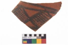 | Description / विवरण | Specimen of potsherd with black decorative geometric diamond set broad horizontal bands painting. |