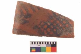 | Description / विवरण | Specimen of potsherd with black decorative geometric Diamond set broad horizontal bands painting, Type Black on Red Ware . |