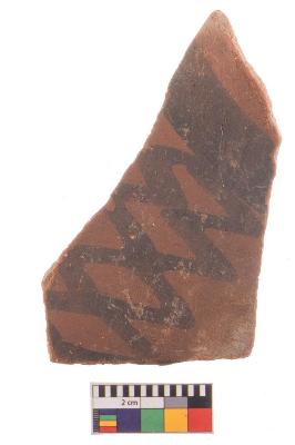 | Description / विवरण | Specimen of potsherd with black decorative zigzag painting, Type Black on Red Ware . |