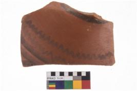 | Description / विवरण | Specimen of potsherd black on red painted pottery. It is fine fabric in sharp contrast with painted design are executed in black pigment. |
