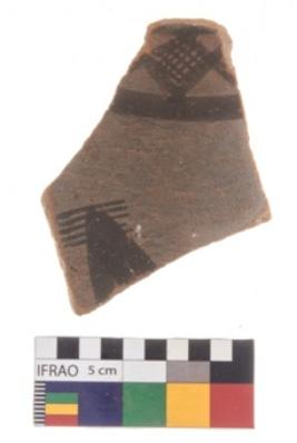 | Description / विवरण | Specimen of potsherd with black decorative geometric diamond set broad horizontal bands painting. |