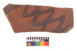 | Description / विवरण | Specimen of potsherd with black decorative zigzag painting, Type Black on Red Ware . |