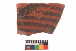 | Description / विवरण | Specimen of potsherd with black decorative geometric Linear painting, Type Black on Red Ware . |