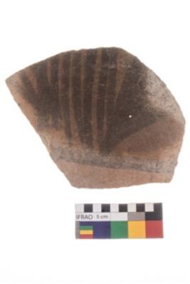| Description / विवरण | Specimen of potsherd black on red painted pottery. It is fine fabric in sharp contrast with painted design are executed in black pigment. |