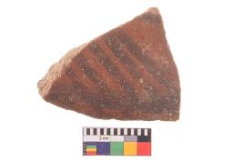 | Description / विवरण | Specimen of potsherd with black decorative geometric Linear painting, Tpre Black on Red Ware . |