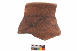 | Description / विवरण | Specimen of potsherd with black decorative geometric Diamond set broad horizontal bands painting, Tpre Black on Red Ware . |