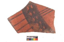 | Description / विवरण | Specimen of potsherd with black decorative geometric Diamond set broad horizontal bands painting, Tpre Black on Red Ware . |