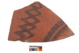 | Description / विवरण | Specimen of potsherd with black decorative zigzag painting, Tpre Black on Red Ware . |