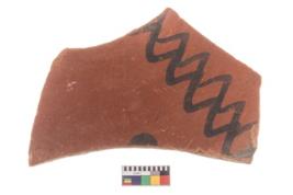 | Description / विवरण | Specimen of potsherd black on red painted pottery. It is fine fabric in sharp contrast with painted design are executed in black pigment. |