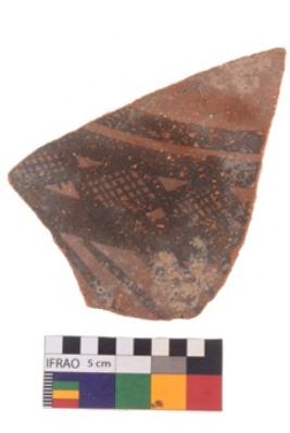 | Description / विवरण | Specimen of potsherd with black decorative geometric diamond set broad horizontal bands painting. |