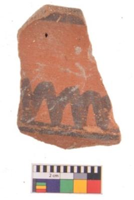 | Description / विवरण | Specimen of potsherd black on red painted pottery. It is fine fabric in sharp contrast with painted design are executed in black pigment. |
