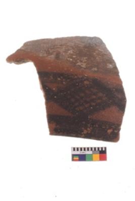 | Description / विवरण | Specimen of potsherd with black decorative geometric diamond set broad horizontal bands painting. |