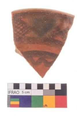 | Description / विवरण | Specimen of potsherd with black decorative geometric diamond set broad horizontal bands painting. |