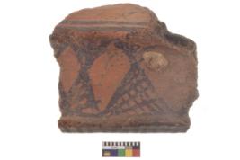 | Description / विवरण | Specimen of black on red ware with decorative geometric lattice double axe forming empty diamonds painting. |