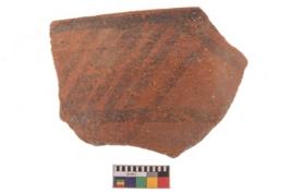 | Description / विवरण | Specimen of potsherd black on red painted pottery. It is fine fabric in sharp contrast with painted design are executed in black pigment. |