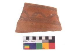 | Description / विवरण | Specimen of potsherd black on red painted pottery. It is fine fabric in sharp contrast with painted design are executed in black pigment. |